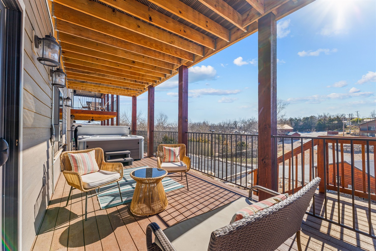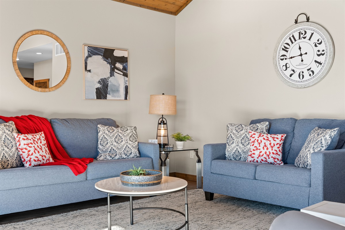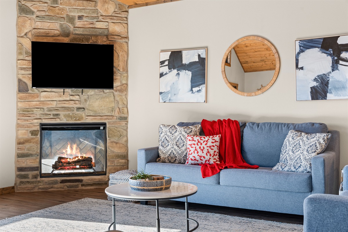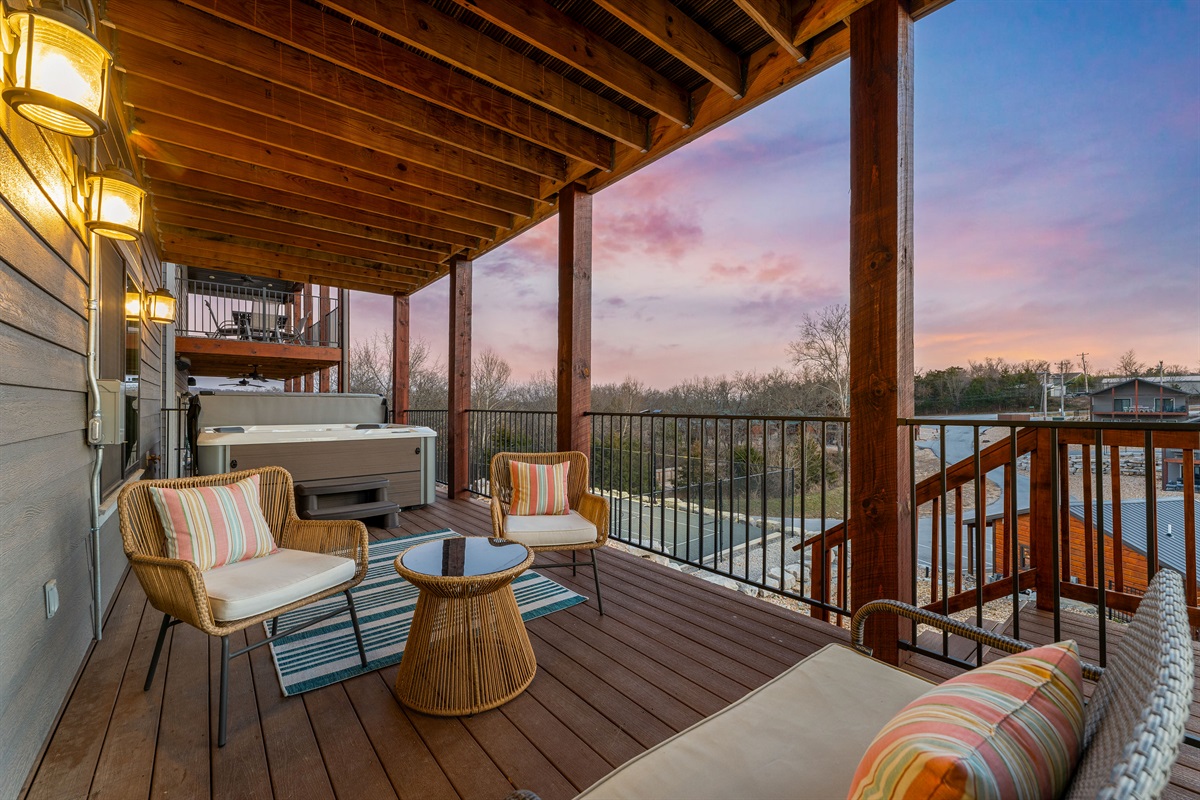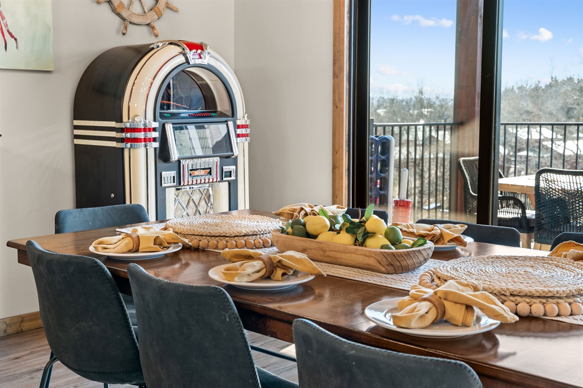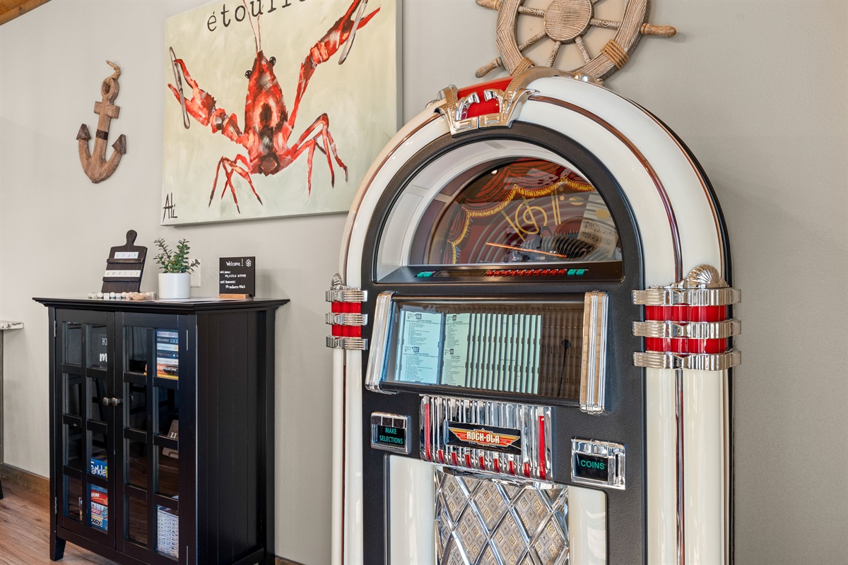 Inside, nautical-inspired crawdad décor adds a playful coastal charm. After a full day outdoors, unwind in the private saltwater hot tub ♨️ under the Ozark sky, gather around the fireplace 🔥, or turn up the retro jukebox 🎶 for a fun evening in. Two spacious decks provide the perfect setting for fresh air and stargazing.