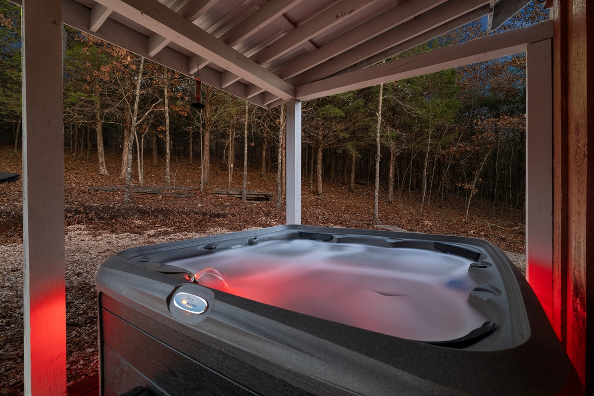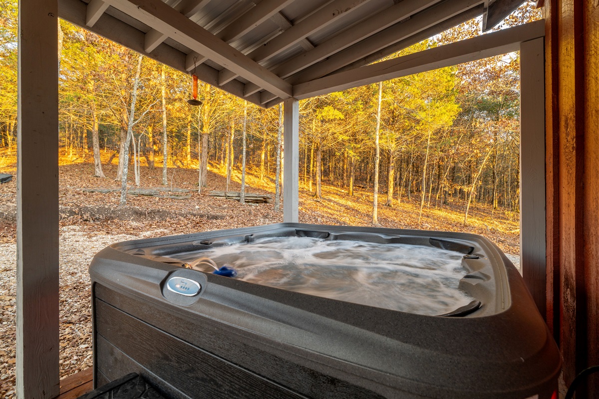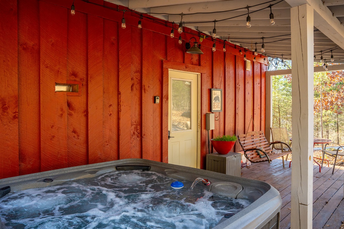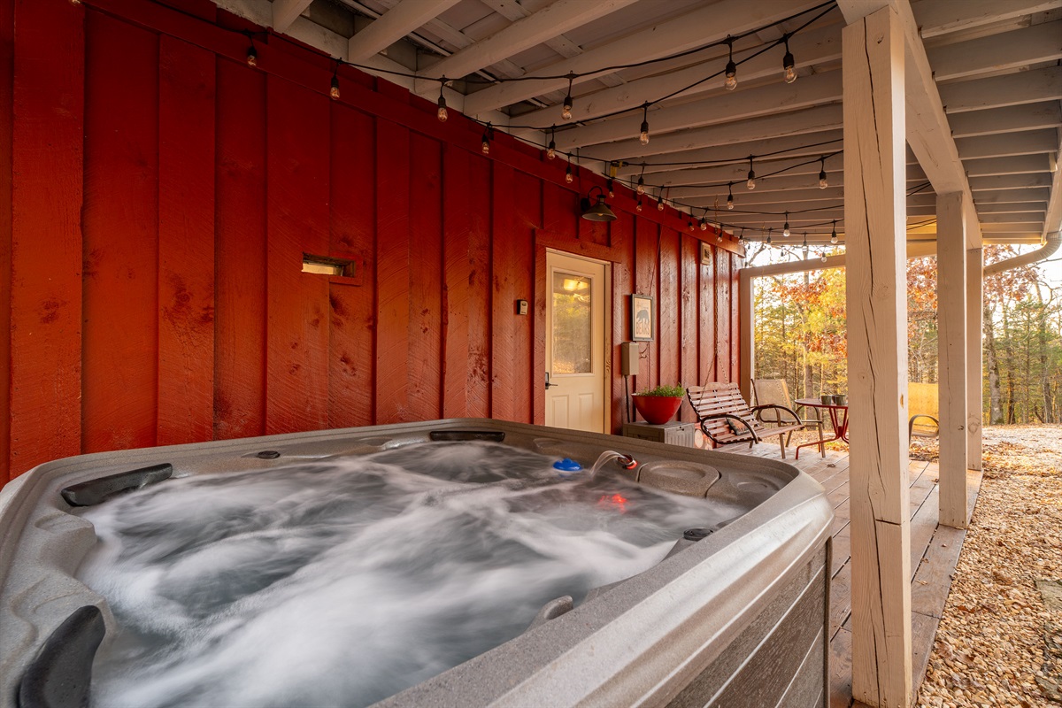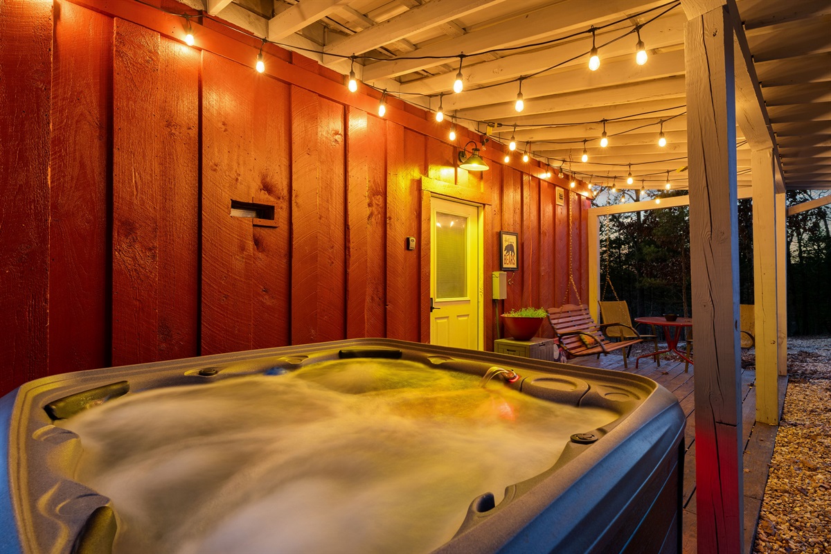 Step onto the covered front porch and slip into the private hot tub, perfect for soaking under the stars or enjoying a quiet morning with coffee in hand.