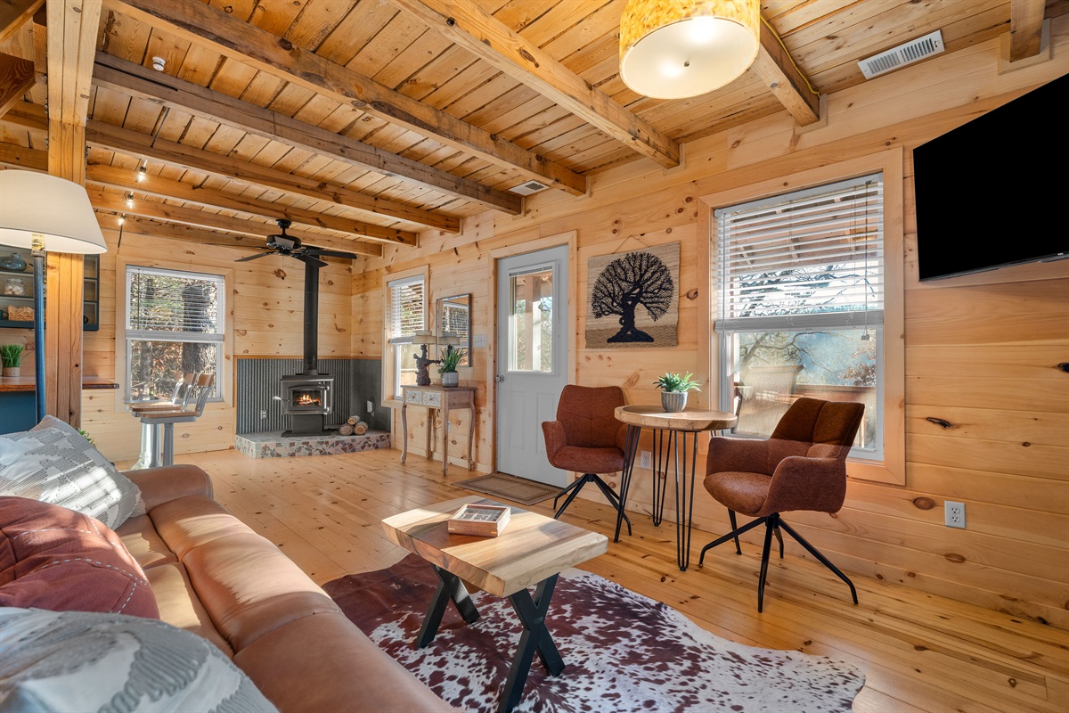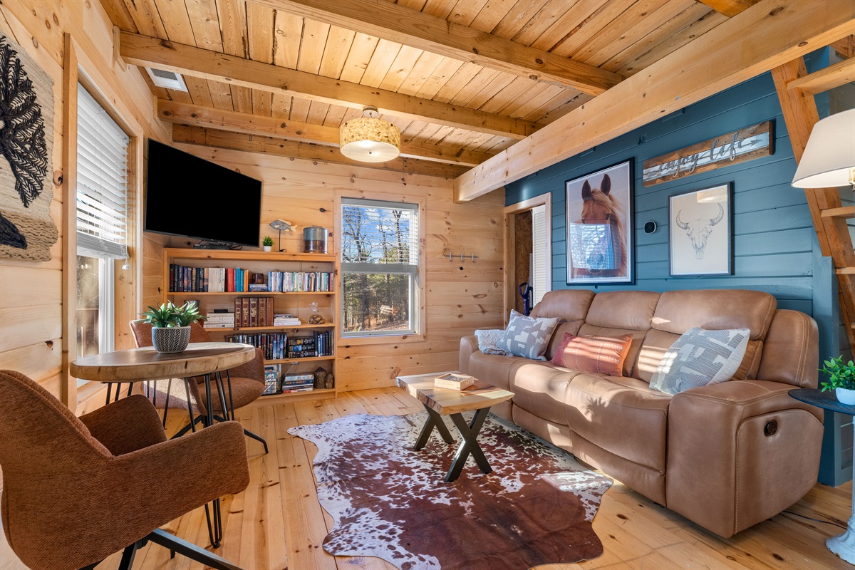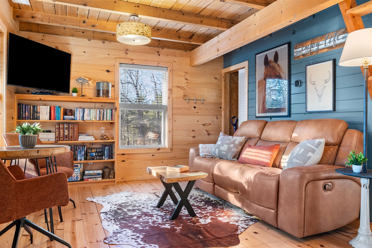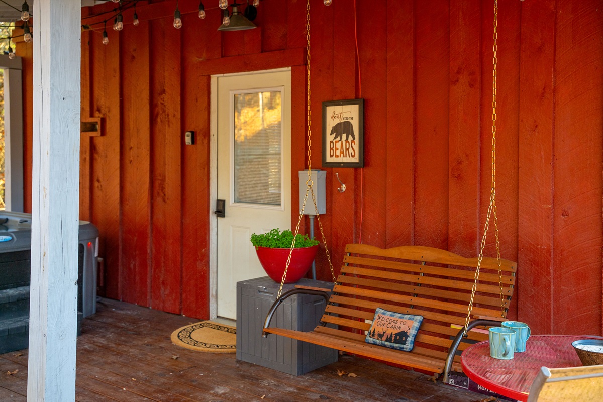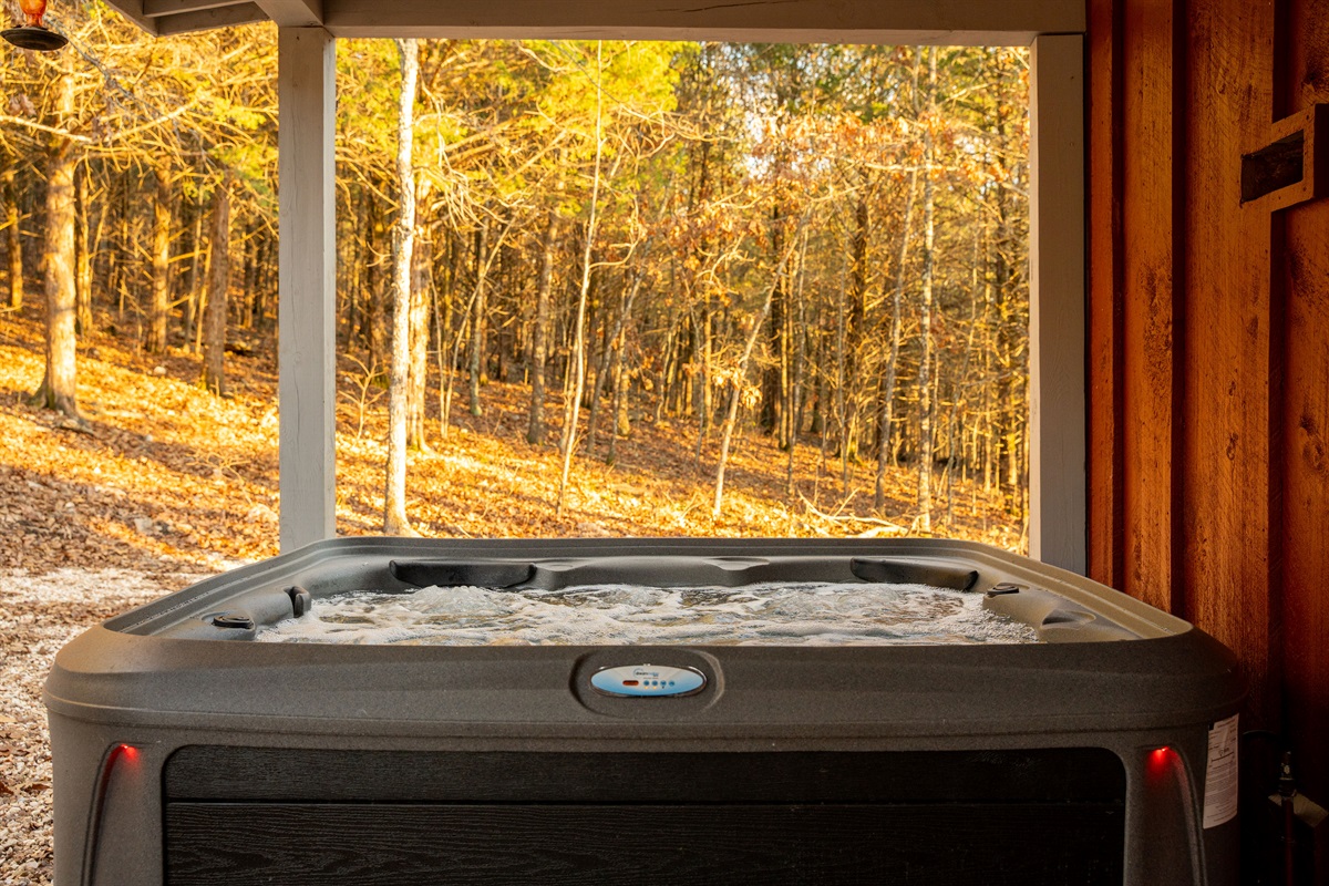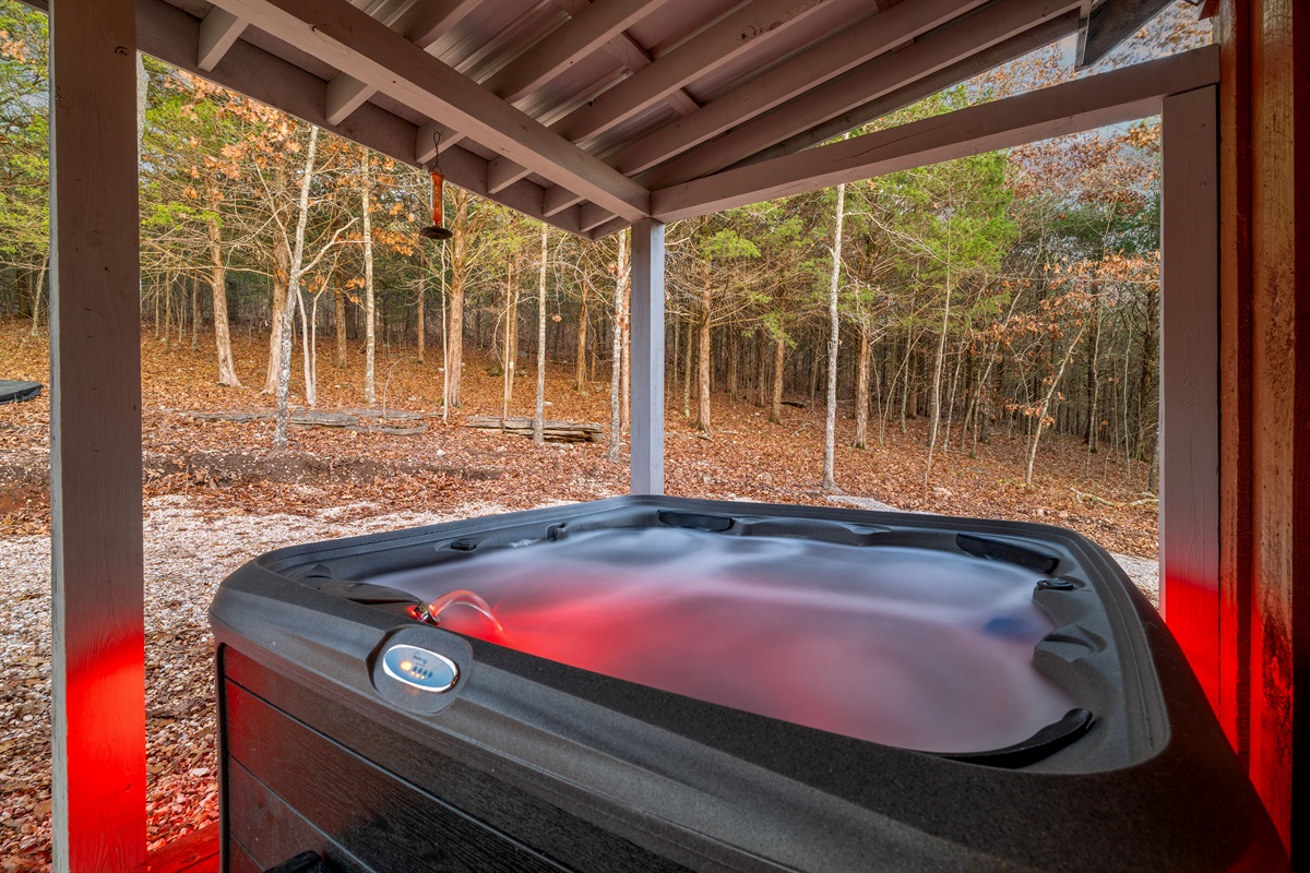 Step onto the covered front porch and slip into the private hot tub, perfect for soaking under the stars or enjoying a quiet morning with coffee in hand.