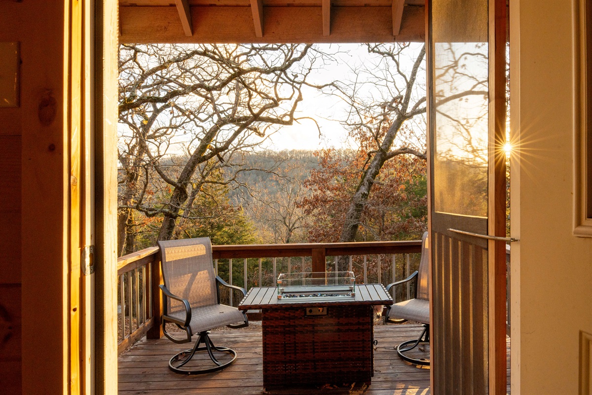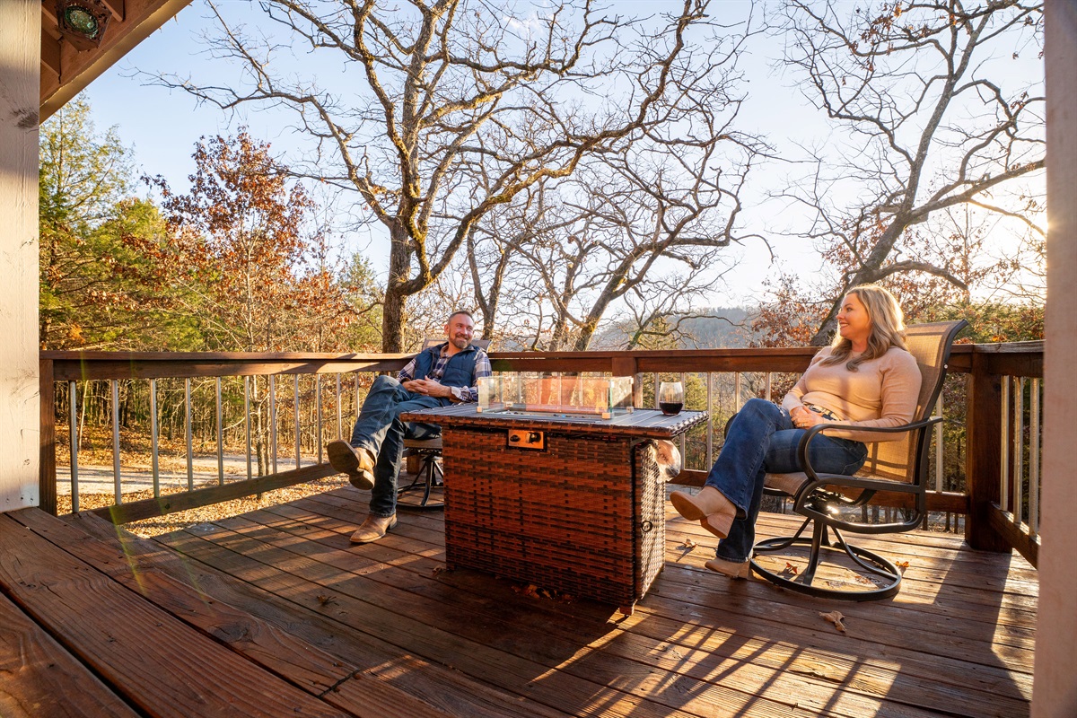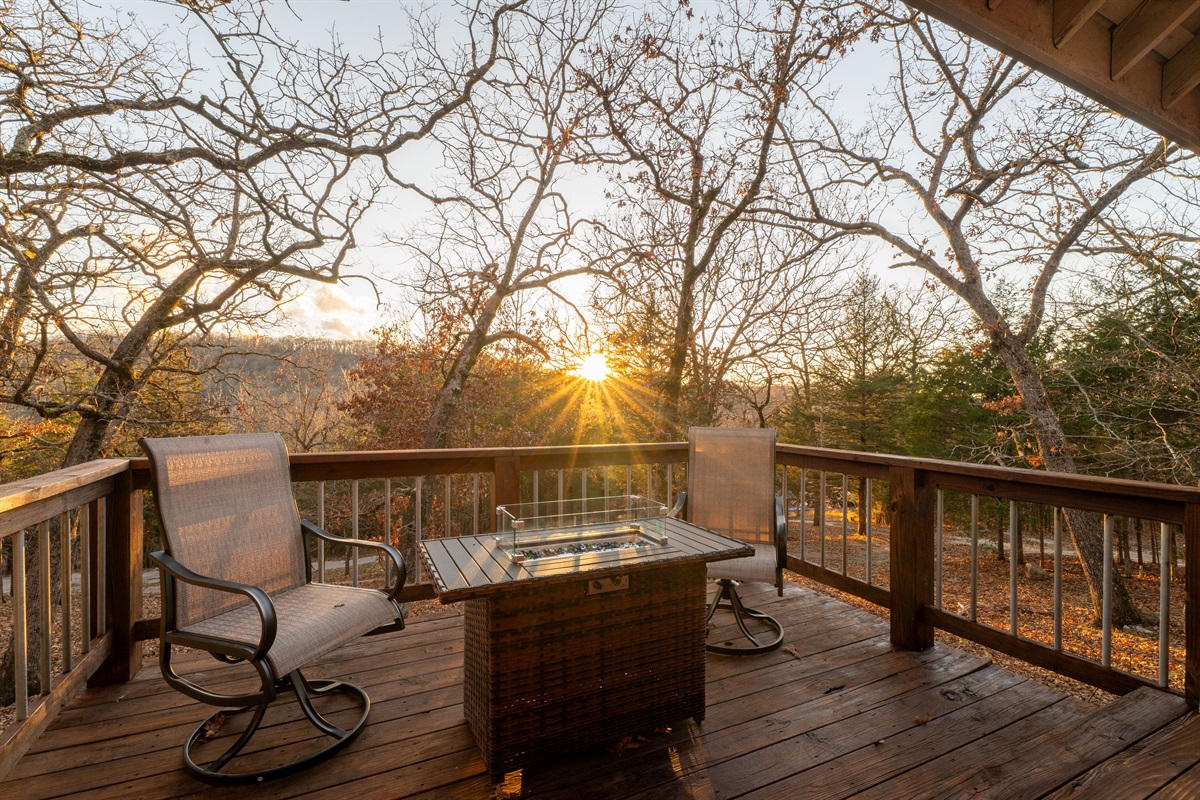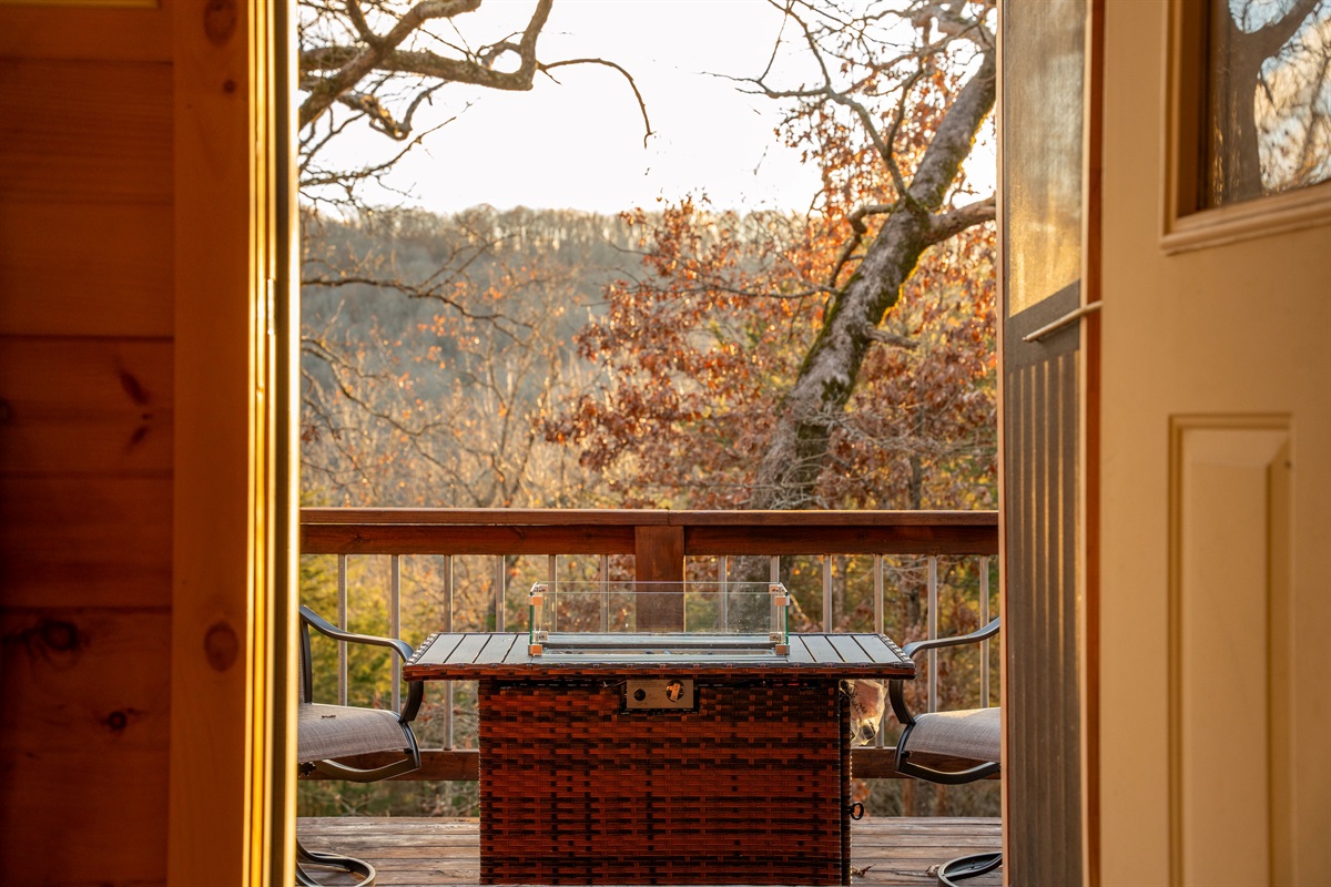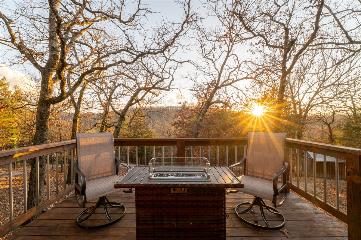 • Back porch with propane fire pit, where you can relax and take in the Ozark scenery