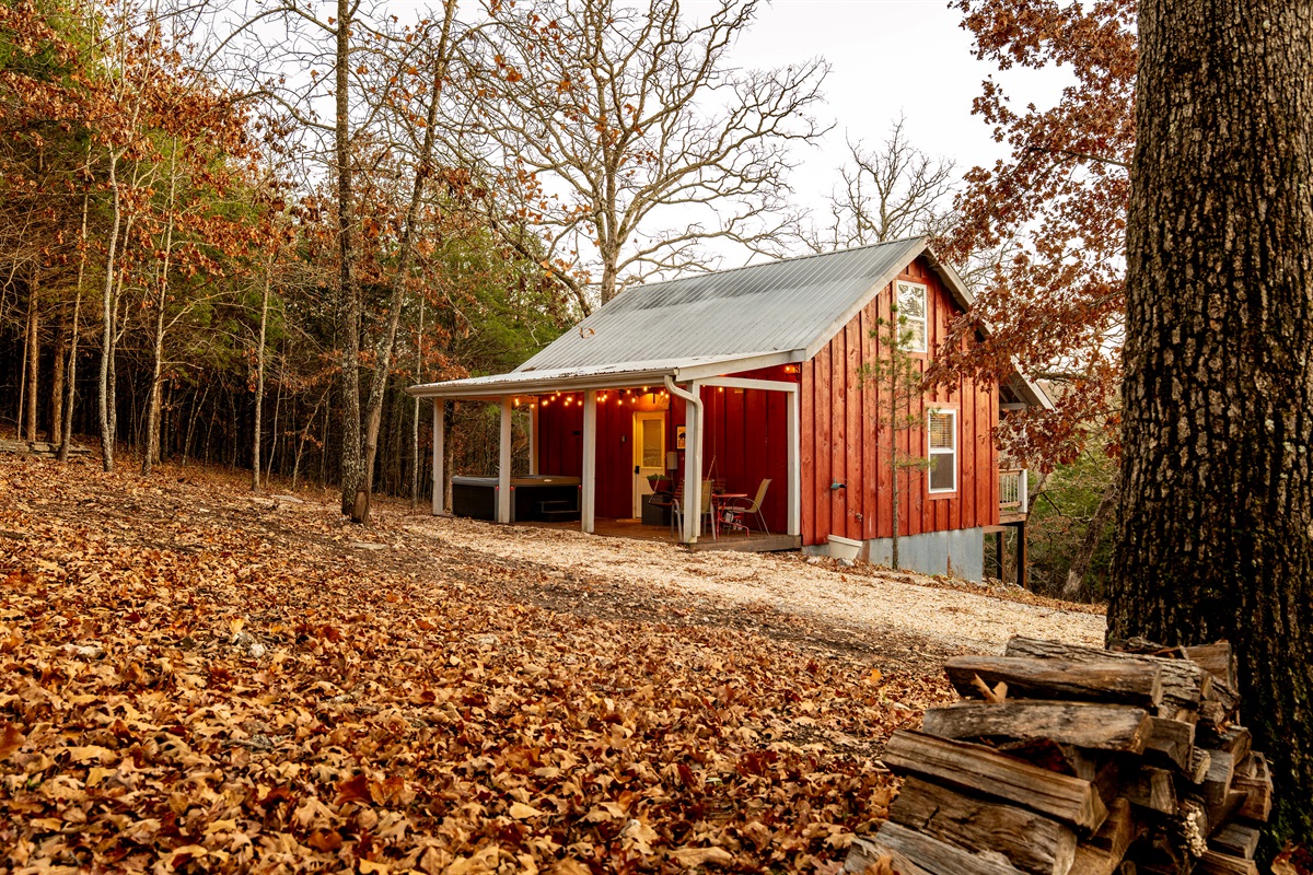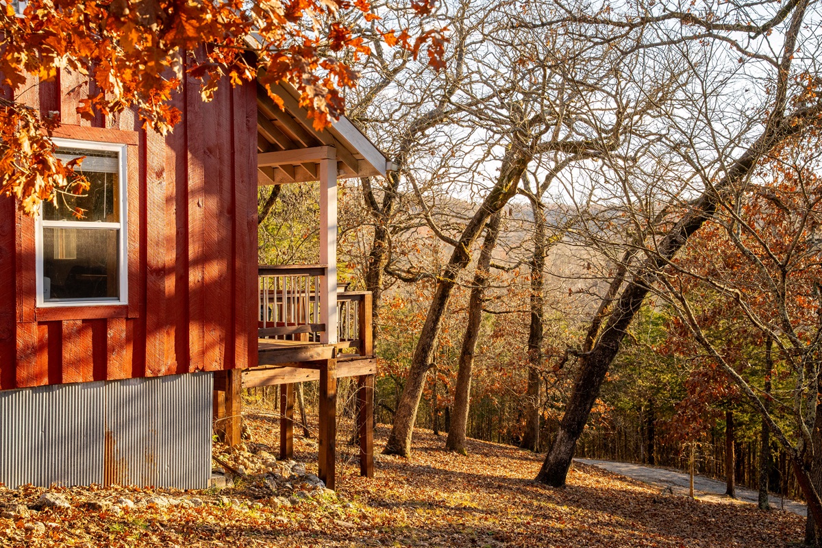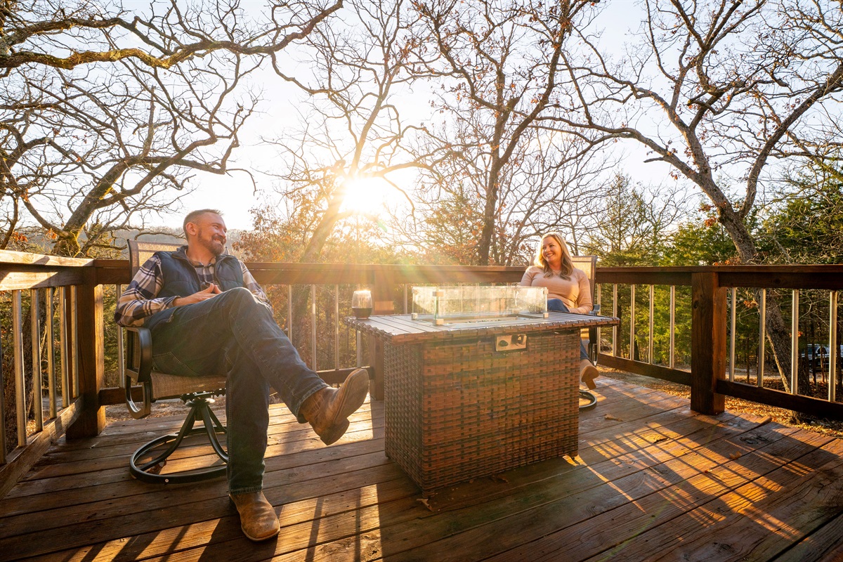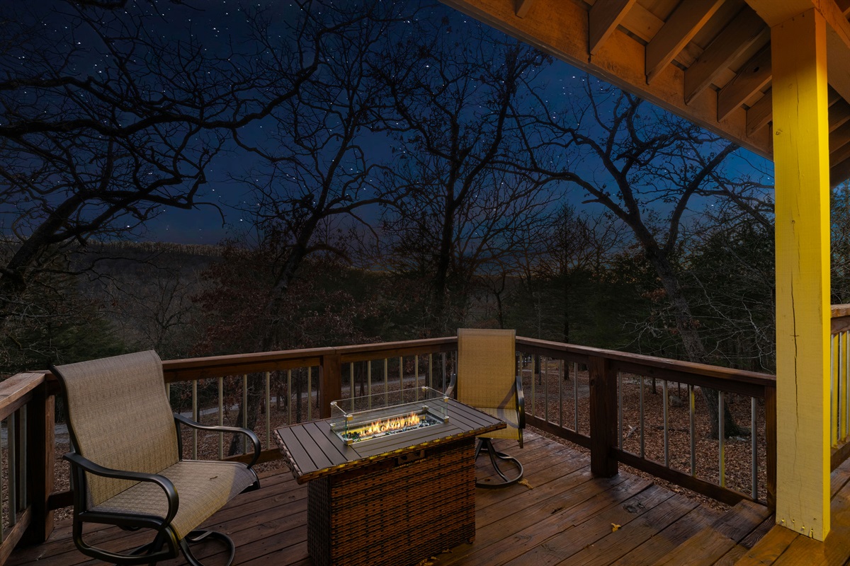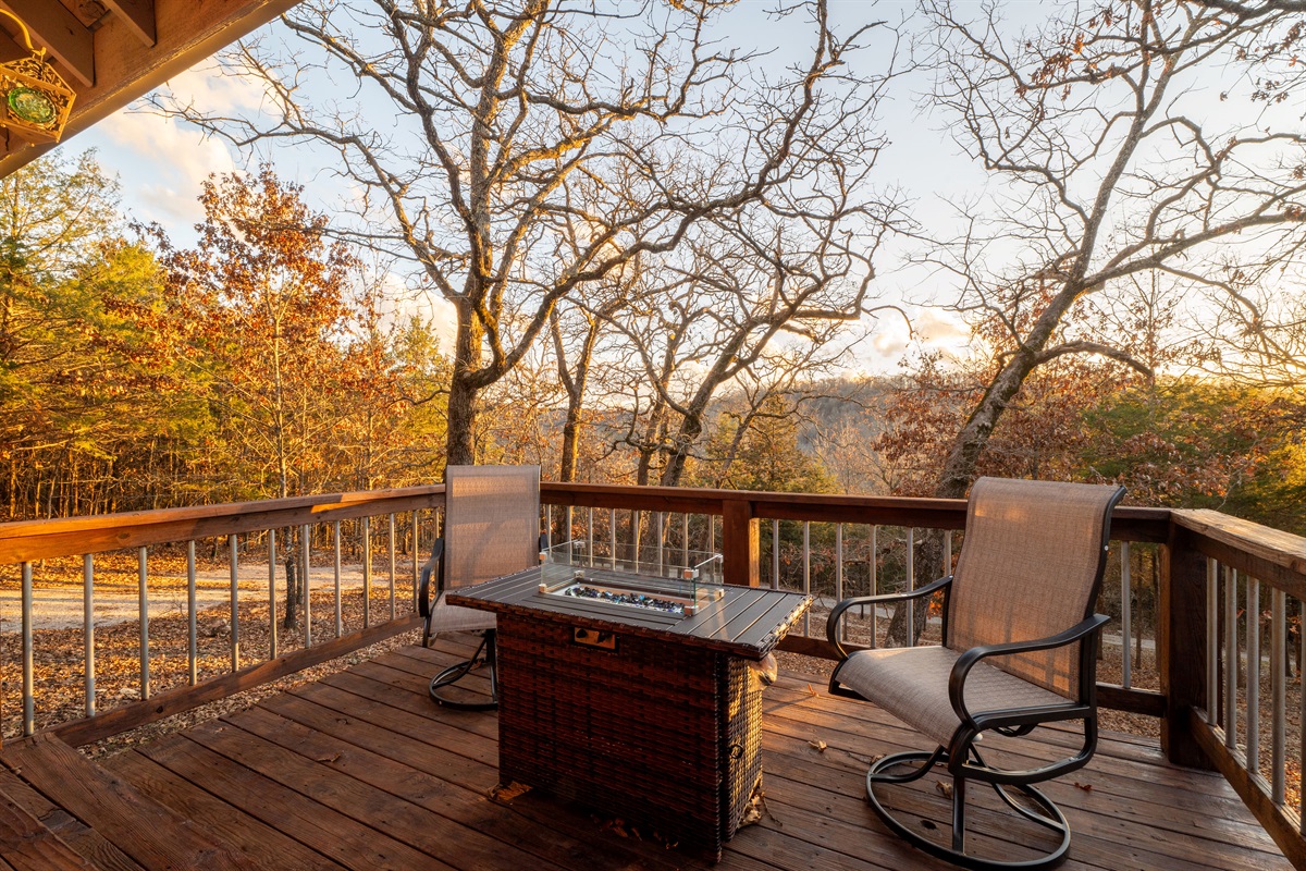 • Back porch with propane fire pit, where you can relax and take in the Ozark scenery