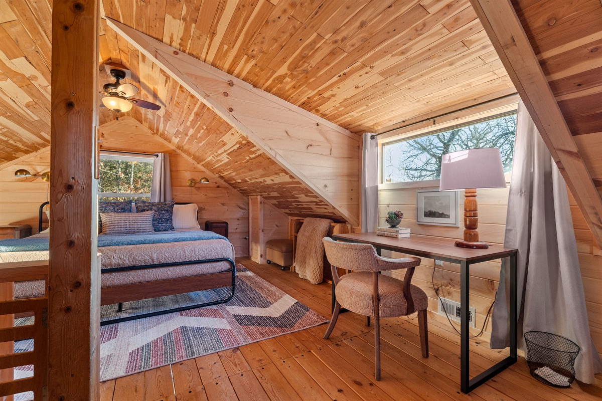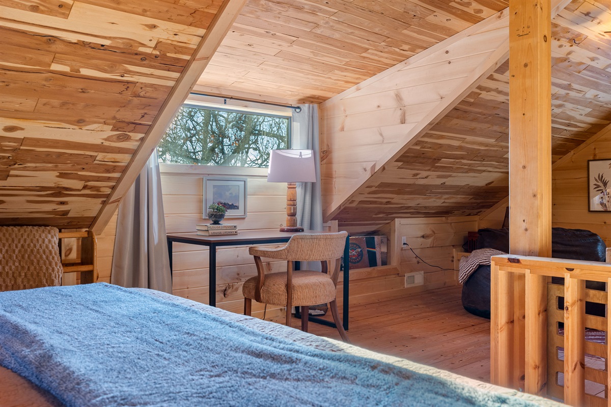 This home is accessible in a gravel road. 4wd is not needed, but you will need front wheel drive or AWD for the driveway. Also, the bed is on the loft level so please refer to staircase photo.