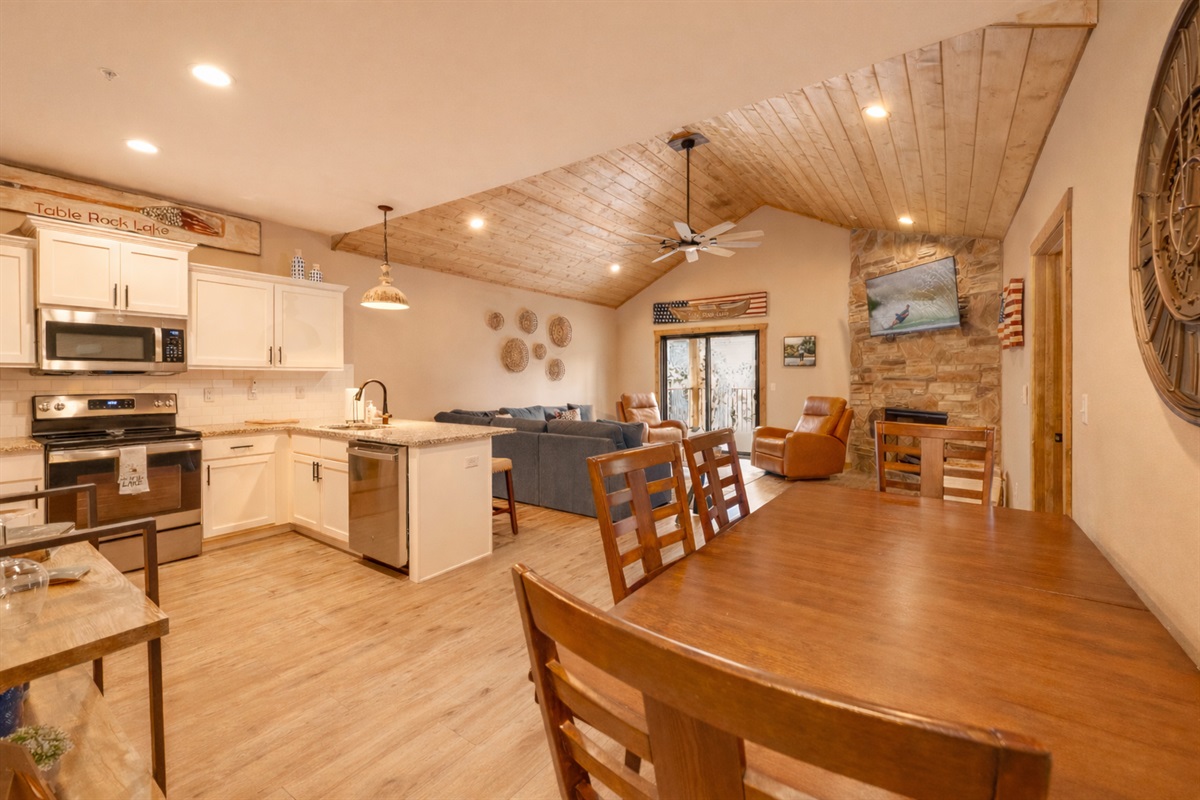 Inside, the fully stocked kitchen 🍳 makes gathering for home-cooked meals easy, while the open living area invites everyone to relax and unwind. Step onto the spacious upper deck to enjoy shuffleboard, patio lighting, and evenings around the fire table 🔥. The lower deck provides additional outdoor seating for quiet lakeside moments.